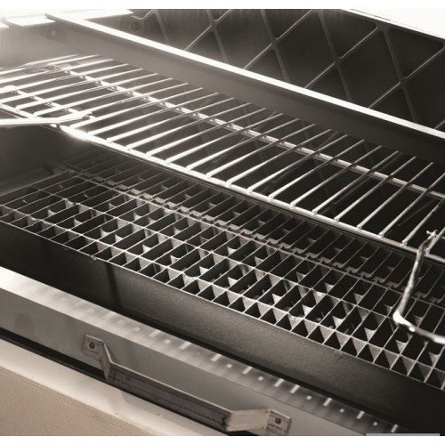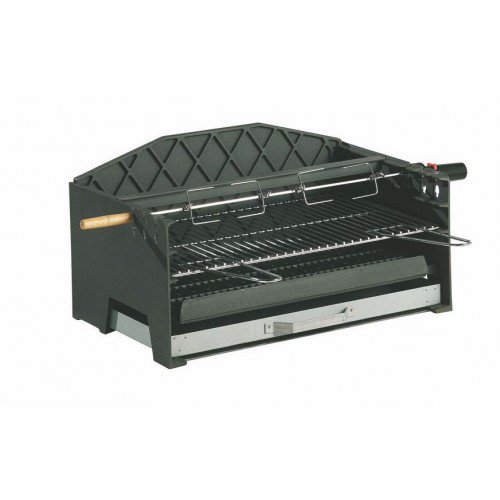 Барбекю на древесном угле – контейнер очага чугунный, продуваемый, крупнообъёмный Эксклюзивный аппарат, большой зольный ящик, регулируемая по высоте решетка, несколько положений для вертела, чугунная колосниковая решетка поддерживает древесный уголь, при работе в режиме жаровни древесный уголь нагревает излучением и предупреждает воспламенение жиров.