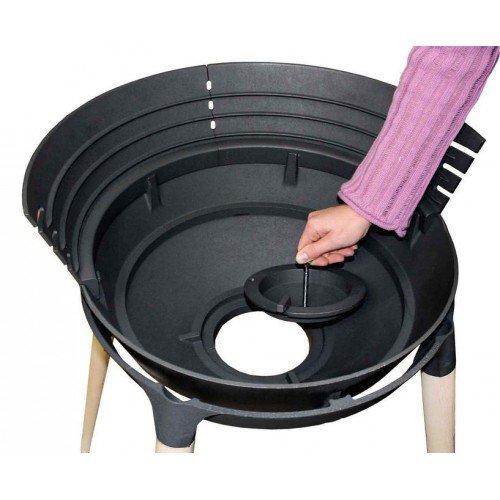 Полностью чугунный контейнер очага с защитным экраном. Устройство шлакоудаления внизу очага. Центральная вентиляция с диффузором. Решетка для древесного угля. Регулирование решетки по высоте. Досягаемая рабочая поверхность. 4 деревянные ножки.
