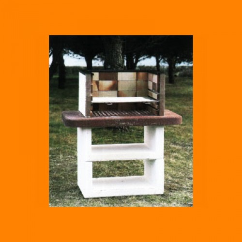 Барбекю из конгломерата белого и коричневого цвета. Топка из огнеупорного кирпича с решеткой для жарки и направляющими.