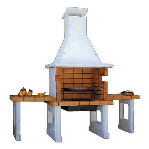 Барбекю с возможностью приготовления паэльи, из конгломерата белого цвета. Плита и топка из огнеупорного кирпича, встроенные решетка и зольник. Размер топки 90х70.