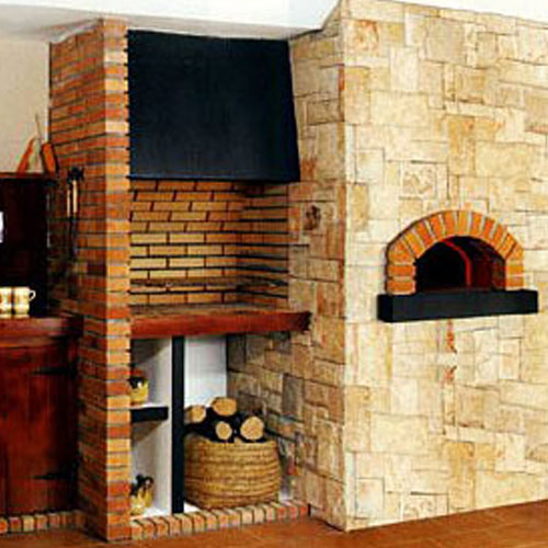 Комбинированная барбекю из камня Serol симметричного без шва. Центральный пилар, арка духовки и топка из огнеупорного кирпича, черная гранитная плита, грес. Дверцы из обработанного дерева, металлический короб черного цвета. Духовка размером 80 см, топка с решеткой для жарки и направляющими.