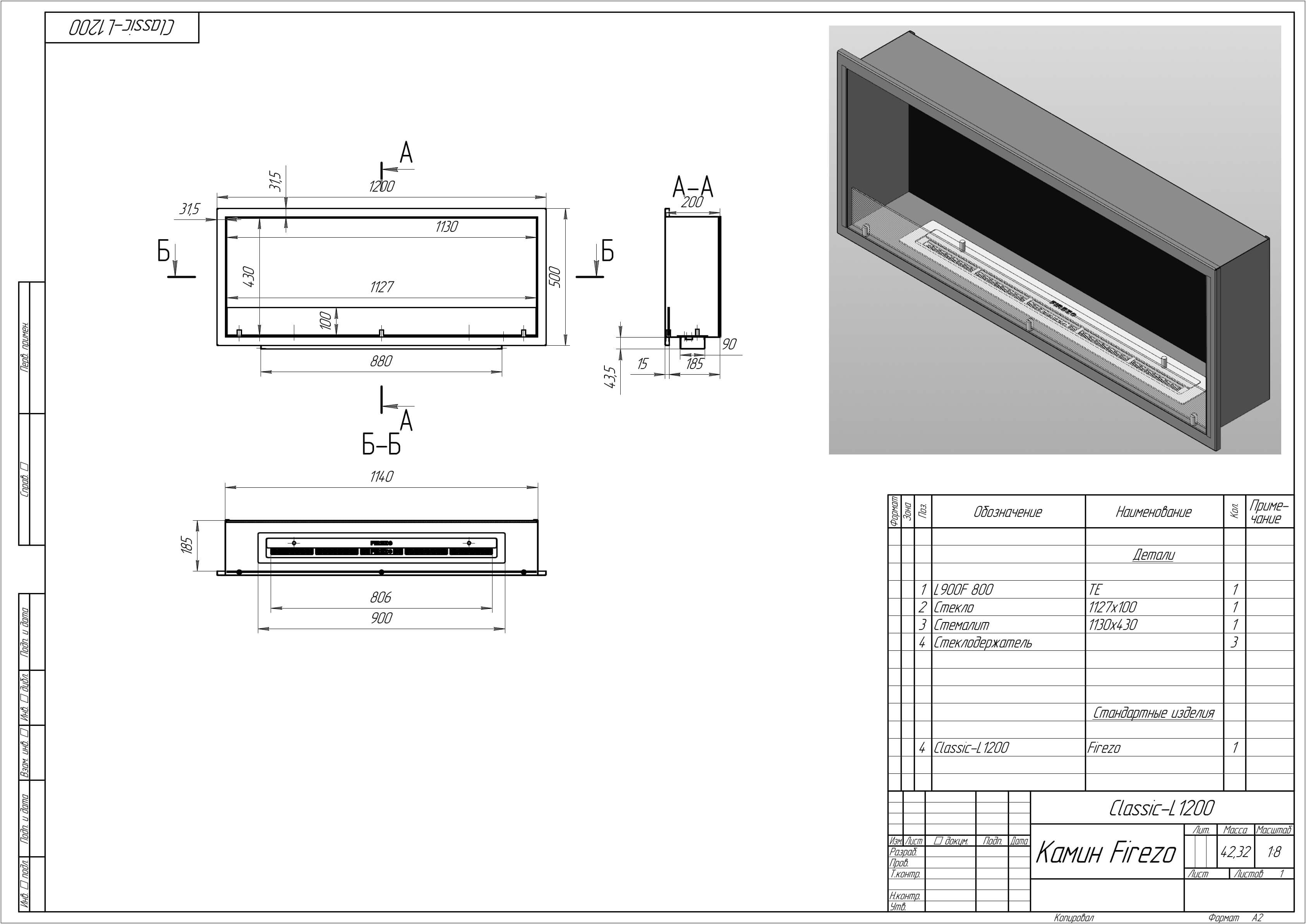 - Базовые размеры камина: 1200x200x450 мм