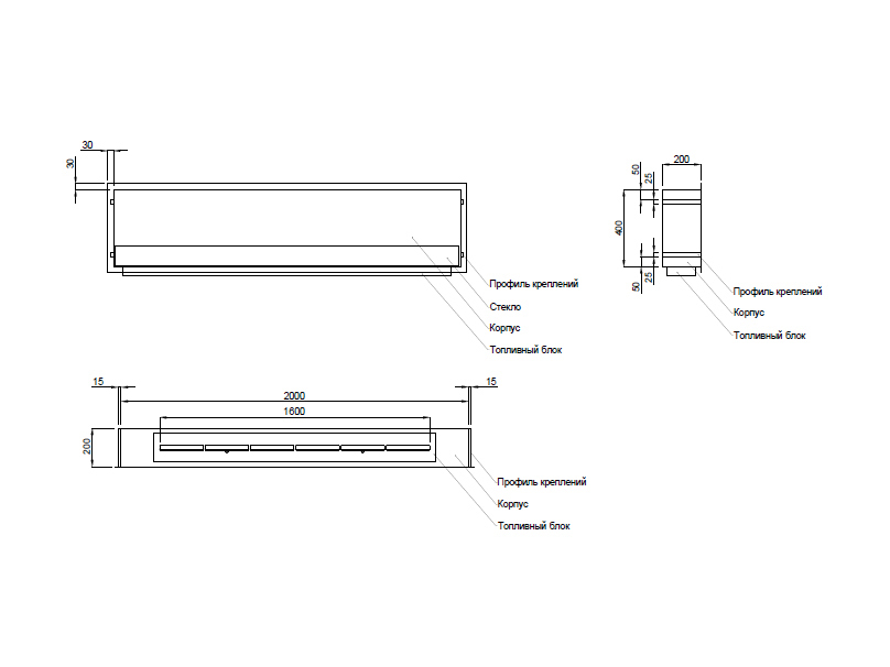 - Габаритные размеры ШxГxВ, (мм): 2000x200x400