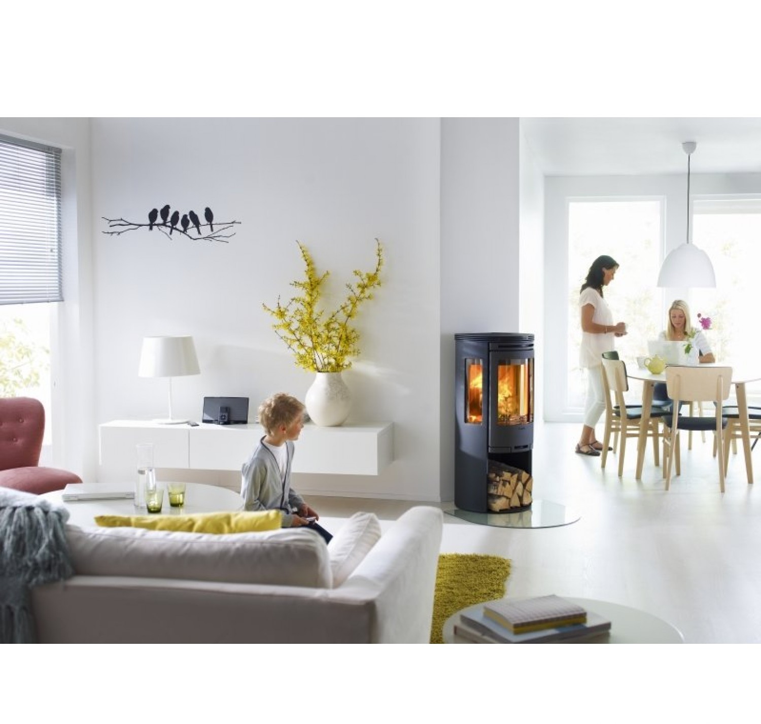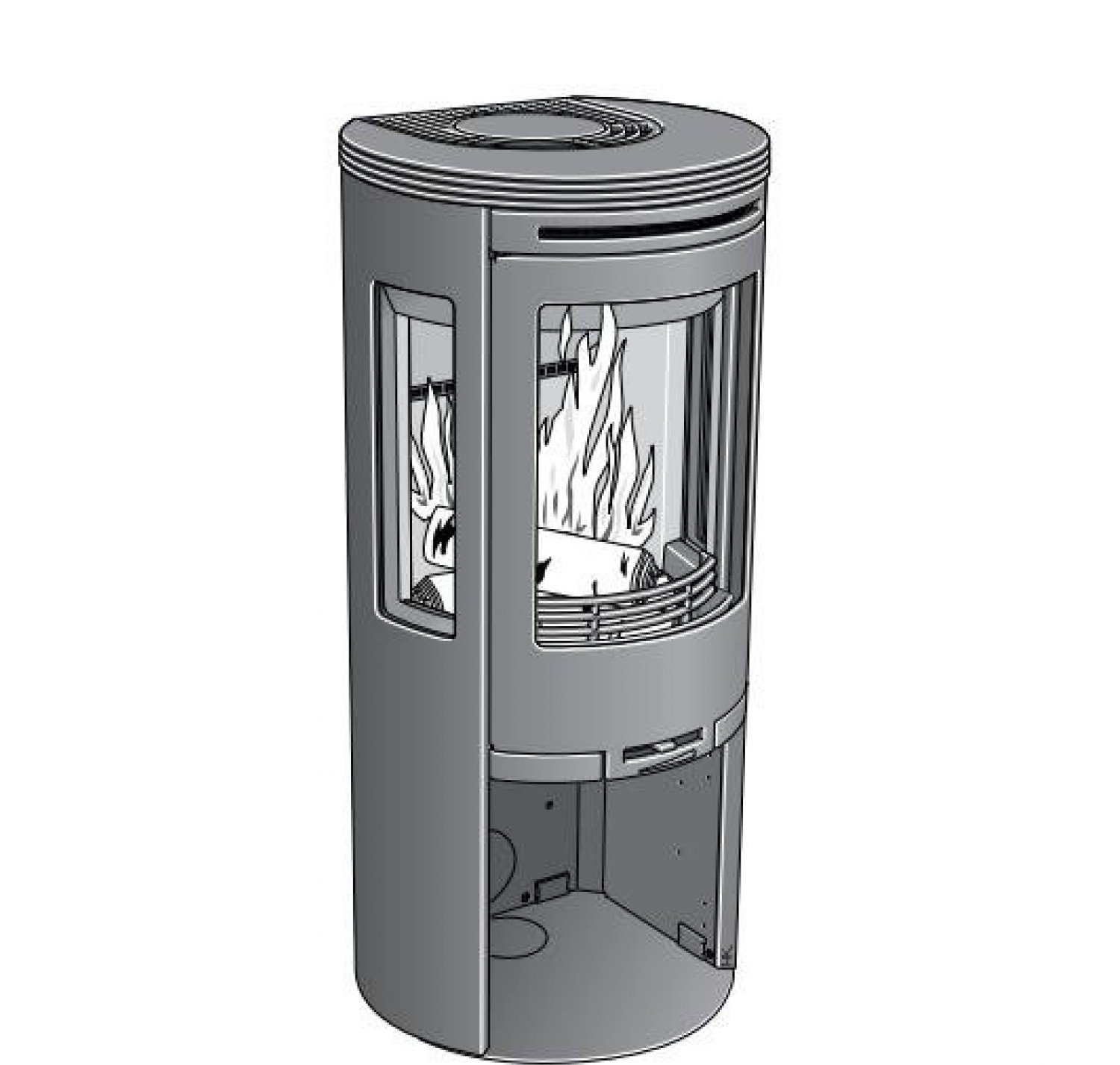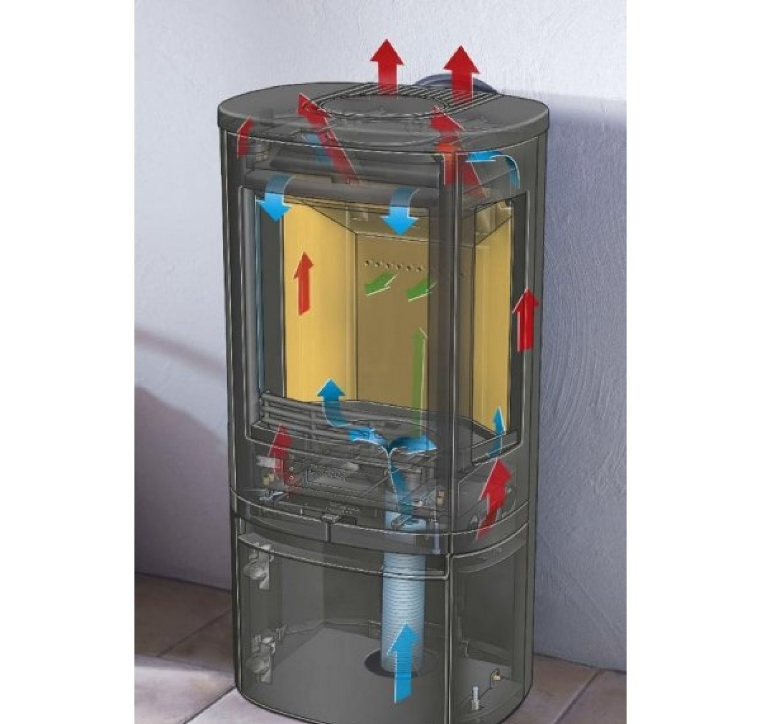 Печь-камин Contura 556. Большие боковые стекла создают ощущение открытого пламени. Теперь можно почувствовать тепло огня и увидеть пламя с дивана или сидя за столом. Большое керамическое стекло дает максимальный обзор внутри просторной топки. Уникальные просветы сбоку позволяют видеть огонь и со стороны, т.е. максимально увеличить ощущение тепла и света. Во всех моделях Contura 500 прямо через топку в ее верхней части проходит четыре конвекционных трубы. В задачу этих труб входит охлаждать дым, нагревая одновременно воздух, который проходит сквозь эти трубы и выходит в комнату. С задней стороны на камине всасывается холодный комнатный воздух, который опять выходит в комнату через решетку в верхней части камина уже нагретый до температуры выше 150С.