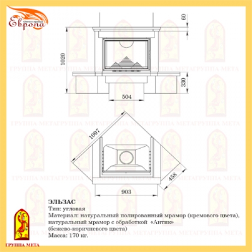 Материал: натуральный полированный мрамор (кремового цвета), натуральный мрамор с обработкой «Антик» (бежево-коричневого цвета)