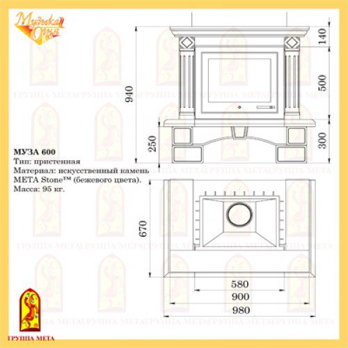 Каминная облицовка Муза 600 изготовлена из камня META Stone™ (бежевого цвета). Вставки в боковые панели выполнены из пеноблока и подготовлены для последующей отделки (может использоваться любая отделка, толщина материала не более 30 см). Отделочный материал в комплект не входит.