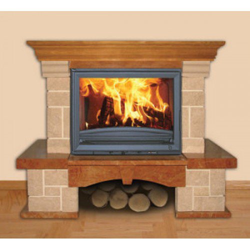 Облицовка и декоративные элементы выполнены из колотого мрамора Декоративная деревянная балка служит небольшой полочкой. Предусмотренно место для хранения дров.