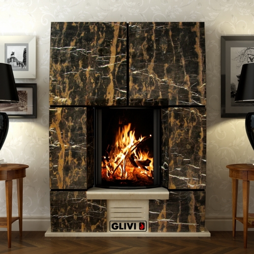 - Камин выполнен из полированного мрамора Black and Gold, Crema Marfil.