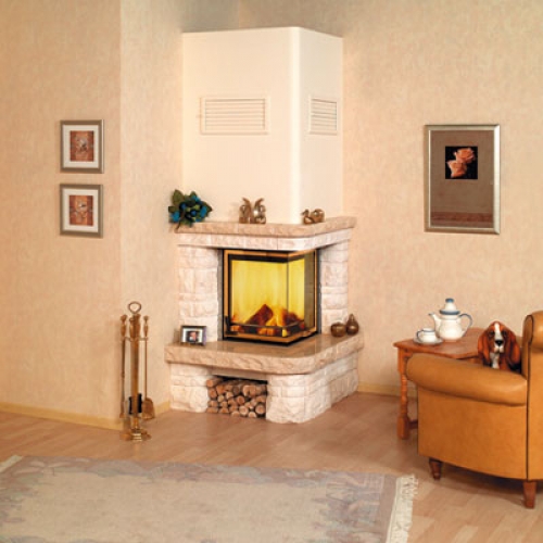 Дровяной угловой камин с чугунной топкой. Топка с двухсторонним огнеупорным стеклом. При выполнении данной модели камина использован натуральный камень грубой обработки и гладкий мрамор. В нижней части камина расположена ниша для дров.