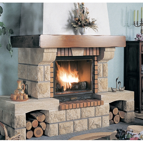 Декоративный камин, выполненный в стиле кантри. Портал облицован песчаником. Декоративная балка выполнена из экзотической древесины Iroko. Топка с прямой дверцей из термостойкого стекла. Боковые банкетки служат нишами для дров.