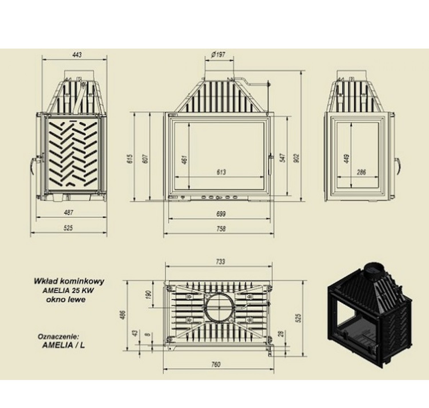 Amelia L— топочная камера или топка-вкладыш, предназначенная для отопления дома площадью до250 кв.м. Топочные камеры представленной серии Amelia Lизготавливаются из чугуна, который обладает хорошей теплоотдачей, КПД закрытой топочной камеры имеет довольно высокие значения. Представленная модель— это один извариантов стандартной топки большой мощности серии Amelia. Модель Amelia Lимеет дополнительное стекло слевой стороны, дверца одна (фасадная) иимеет боковое открытие. Особенности оборудования серии Amelia LотKRATKI: Чугунная топка непрерывного сгорания; Топка высокой мощности, предназначена для больших помещений; Топка углового типа— слевой стороны имеется дополнительное остекление; Теплоемкость прибора увеличивают ребра повсему корпусу; Топливо— сухие дрова длиной до500 мм; Стекло— термостойкая стеклокерамика, предел нагрева 800 С; Полная герметичность дверцы; Система «двойного дожига»; Топка имеет съемную ручку надверце; Прозрачность стекла обеспечивает система встроенного обдува; Предусмотрен держатель дров— непозволяет рассыпаться при открытии дверцы; Дно топочной камеры имеет отверстие для золы.