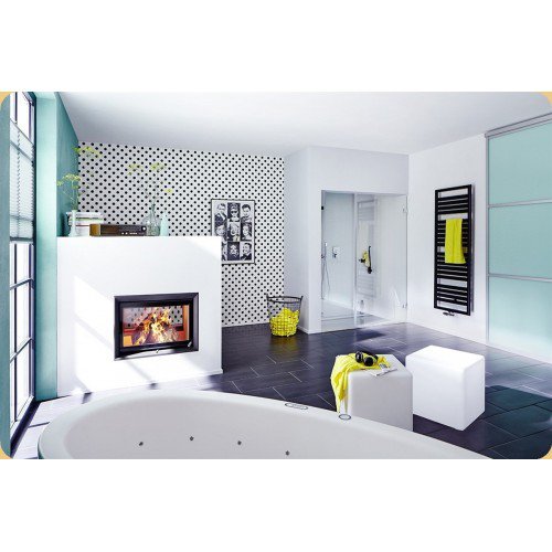 Двухсторонняя каминная топка с прямым стеклом. Топочная камера футерована шамотом. Подъёмный механизм двери (система Easy-Lift). Ширина дверки 656 мм. Высота дверки 488 мм. Возможно подключение воздуха из-вне. В комплекте поставляется декоративная или монтажная рамка.