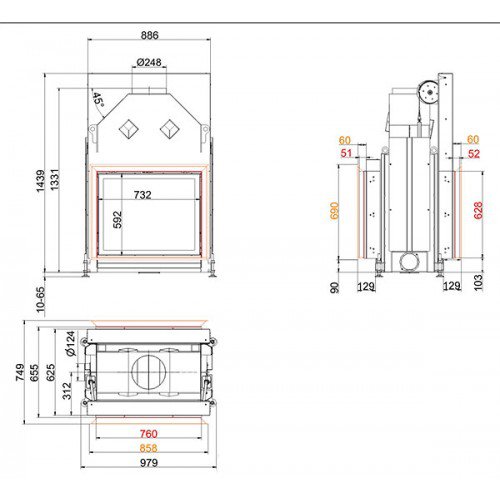 Двухсторонняя каминная топка с прямым стеклом. Топочная камера футерована шамотом. Подъёмный механизм двери (система Easy-Lift) с одной стороны. С другой стороны дверца откидывается для чистки. Возможен вариант топки с подъёмным механизмом с двух сторон (по запросу). Ширина дверки 732 мм. Высота дверки 592 мм. Возможно подключение воздуха из-вне.