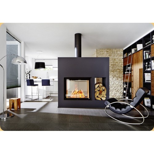 Двухсторонняя каминная топка с прямым стеклом. Топочная камера футерована шамотом. Подъёмный механизм двери (система Easy-Lift) с одной стороны. С другой стороны дверца откидывается для чистки. Возможен вариант топки с подъёмным механизмом с двух сторон (по запросу). Ширина дверки 874 мм. Высота дверки 722 мм. Возможно подключение воздуха из-вне. В комплекте поставляется декоративная или монтажная рамка.