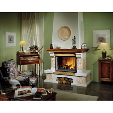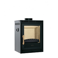 Горизонтальная топка с подъемным механизмом двери. Благодаря большой мощности, такая топка способна отапливать большие помещения и сохранять тепло на протяжении длительного времени. Стенки очага защищены шамотом. Дверь с прямым керамическим стеклом, устойчивым к высоким температурам.