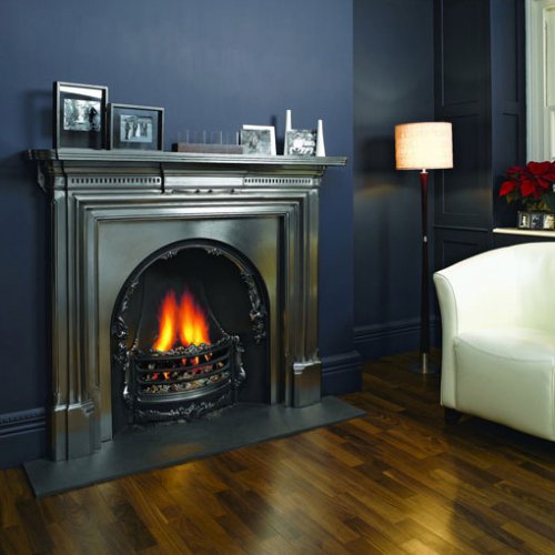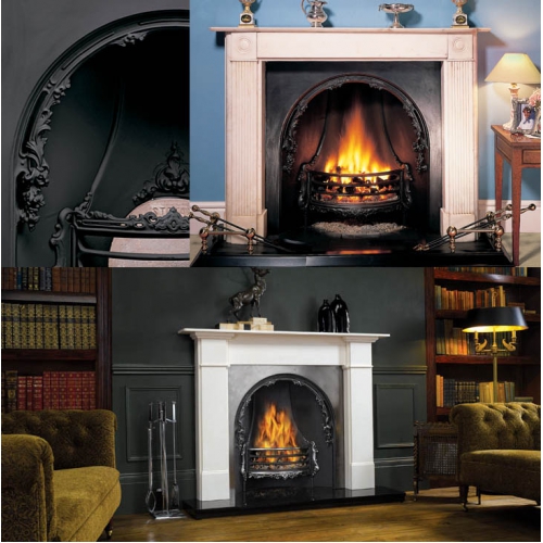 Art Nouveau - открытая чугунная каминная топка в английском стиле. Расположение топки фронтальное. Компактная каминная топка из чугуна со скошенными стенками изготовлена по старинным технологиям. Она украшена литым чугунным рельефом. Топка может быть декорирована изразцами, расписанными в технике итальянской майолики. Пол перед камином выложен плиткой и оформлен металлическим бортиком.  Чугунные стенки этой топки хорошо отражают тепло в помещении. К тому же, боковые стенки топки всегда сужаются к стене, что повышает эффективность отражения тепла.