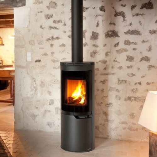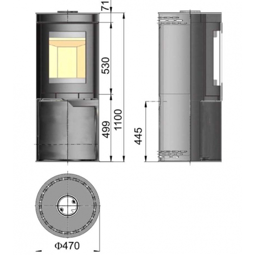 Каминная печь с круглым корпусом из огнеупорной стали. Большое жаростойкое стекло открывает красивый вид огня. Внутренние стенки топки выложены огнеупорным материалом. Экономичный расход топлива, система самоочитски стекла. Внизу имеется отсек для дров с закрывающейся дверцей.