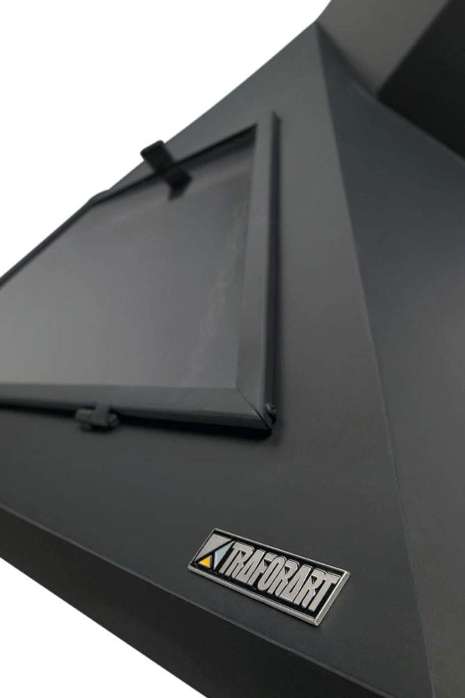 Фронтальный камин со стеклом. Вертикальная труба справа. Камин изготовлен из особой стали. Отделан огнеупорной черной краской, которая выдерживает температуру 650º.