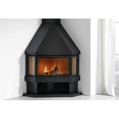 Отопительный камин для углового монтажа. Такой камин займет достойное место в загородном доме. Дверь и боковые стенки из стеклокерамики. Внутренние стенки очага облицованы огнепрочным материалом. В цокольной части расположена небольшая дровница для хранения дров. Система самоочистки стекла. Экономичный расход дров.