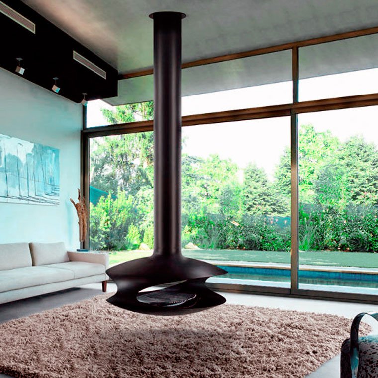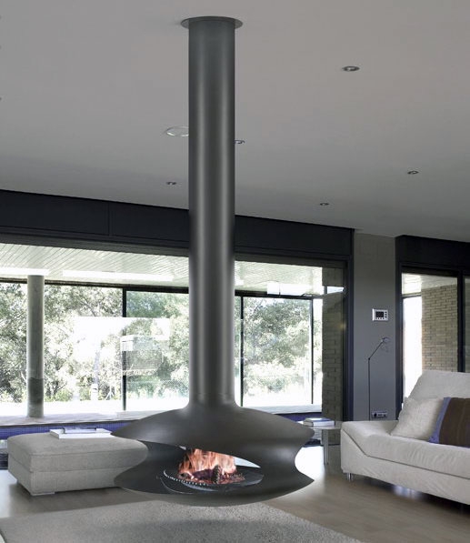 Центральный металличесий камин, открытый по бокам. Колосник и зольник встроены в основание. Высота камина 2,60 м, крепеж вплотную к потолку, механизм межбалочного крепления.