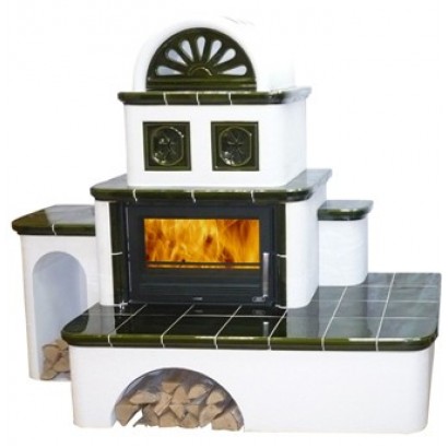 Самая большая кафельная печь в модельном ряду чешского завода «АВХ». Эта модель, безусловно, станет центральным предметом интерьера не только того помещения, где будет установлена, но, пожалуй, и всего Вашего дома. Сочетание изразцовых элементов и белой металлокерамической поверхности делает дизайн этого камина уникальным. Изготавливается в «левом» и «правом» исполнении. Камин комплектуется топкой с номинальной мощностью 10кВт. Цвет облицовки может быть коричневым или зеленым. Наличие 2-х вместительных дровников позволяет создать большой запас топлива, не занимающий дополнительного пространства в помещении.