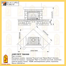 Круглый угловой металлический камин с дверцей. Топка из огнеупорного кирпича, укладка "елочкой". Зольник с решеткой. Ниша для дров. Снабжен телескопическим элементом, позволяющим варьировать высоту от 2,60 до 3,10 м (от потолка до пола) и крепежом к потолку, дымоход диаметром 20 см.