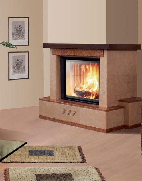 Пристенная облицовка. Боковые детали и цоколь из розового мрамора perlino. Плита и отделка из полированного красного asiago. Балка из темного дерева.