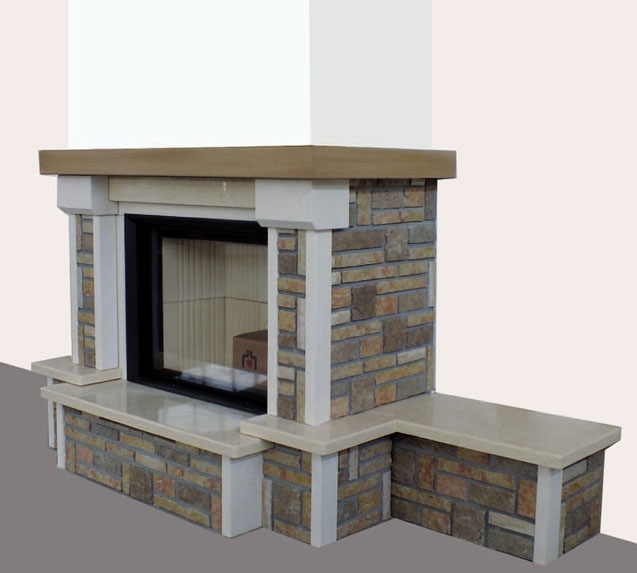 Каминная облицовка с банкетой справа. Основной материал: рваный Vicentino. Материал полки: полированный Trani.