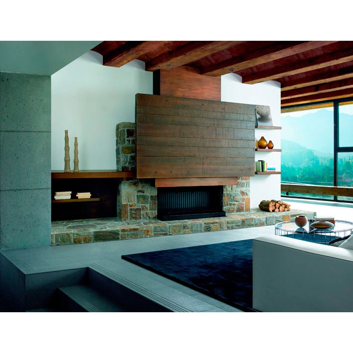 Камин из сланца Nicorella со швом. Боковые детали, колонна и надтопочный короб из состаренного дерева в рустиковом стиле. Консоль декорирована старой медью. Топка Class 120 2L с колосником.