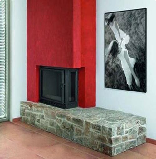 Угловой камин из камня Monte со швом. Чугунная топка модели Premier Convector открытая сбоку.