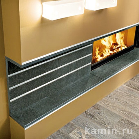 Каминная облицовка из черного гранита с горизонтальными вставками из матовой нержавеющей стали, возможна сокращенная версия.