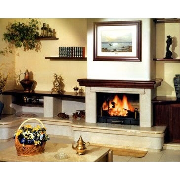 Пристенный камин из бучардированного мрамора Becco.Цоколь и плита из полированного мрамора Crema Benedeta. Деревянная формированная балка. Топка 913 из огнеупорного кирпича.