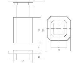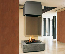 топки. Производители островных дровяных каминов изготавливают различные модификации топки: в одних моделях она может быть закрыта со всех сторон (используется огнестойкое полимерное стекло), в других островных каминах используется топка открытого типа (в таком случае, наверху конструкции предусмотрен продолговатый навесной купол из стали или чугуна, крепящийся на потолке). Есть островные дровяные камины, где используется вращающаяся топка с горящим огнем;
