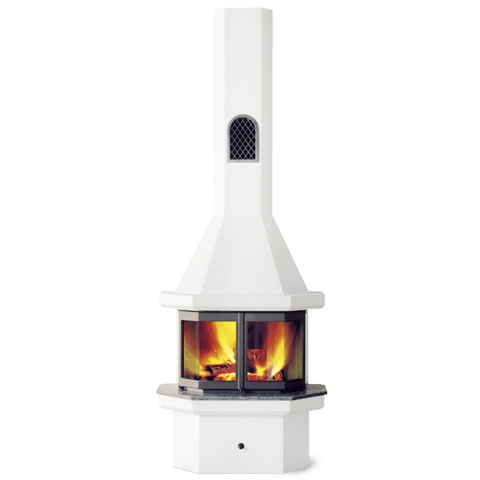 Пристенная печь-камин с задним вариантом  подключения и дверцами с призматическим стеклом.