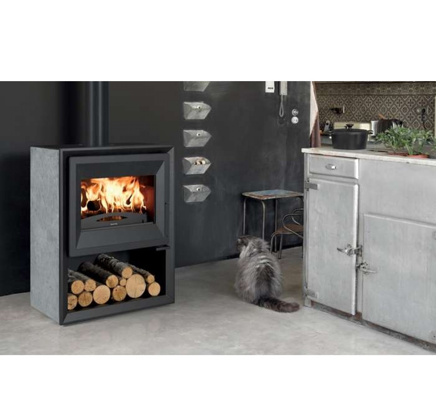 Боковые поверхности из стеатита, печь с дровницей для дров не более 50 см. Чугунная дверь.