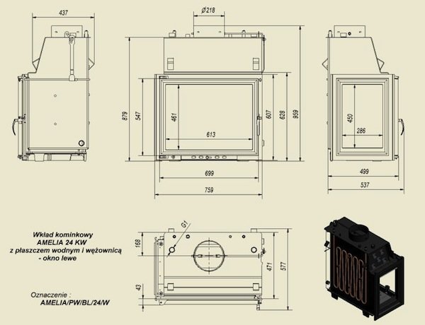 Топка с водяным контуром AMELIA/PW/BL/24/W/Z, стекло слева, змеевик