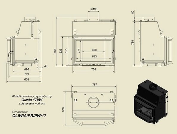 Дровяная топка с призматическим стеклом. Объем теплообменника у нее 35 л. Корпус выполене из 4мм котловой стали и подходит для работы при высоких температурах. Дверца и топочная камера чугунные. С помощью топки Oliwia/PR/PW/17 можно согреть дом площадью 140-170 кв.м