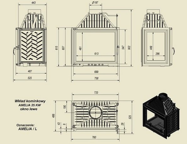 Каминная топка Amelia/L с боковым стеклом слева. Продолжает ряд польских чугунных топок Kratki. Высокая номинальная мощность (25 кВт). Может быть использована в качестве отопительного агрегата в загородном доме площадью 200-250 кв.м.