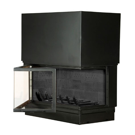 Угловая правая каминная топка со стеклом 16/9. Кирпичи - черного цвета. Стекло топки - цельное.