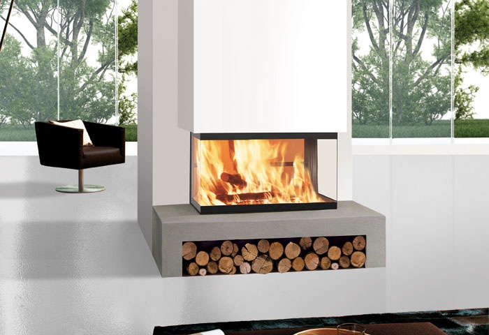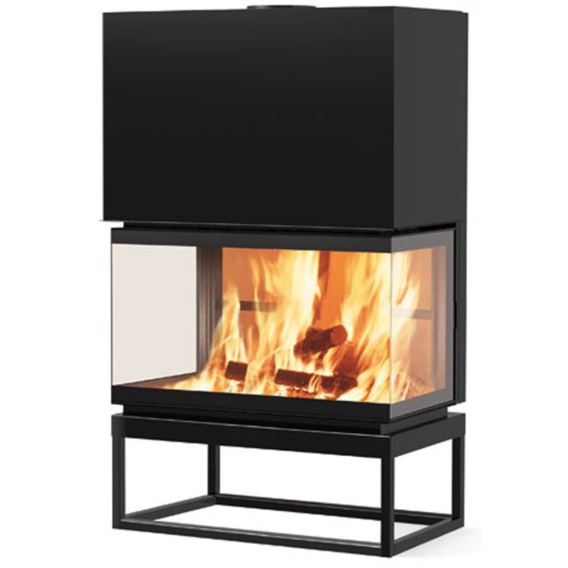 Трехсторонняя топка с 3 стеклянными элементами и обширным обзором огня, с очагом из огнеупорного материала, циркуляцией горячего воздуха посредством естественной конвекции.