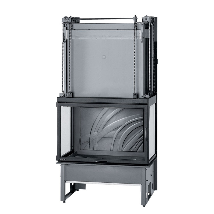Топка с панорамной трехсторонней дверцей, поднимающейся вверх.