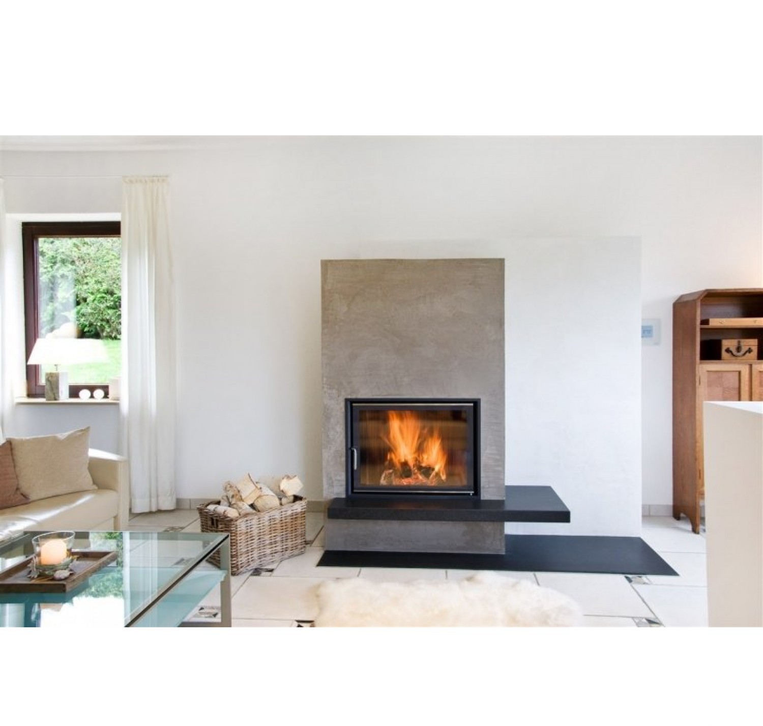 Стальная каминная топка с прямым стеклом. Боковое открывание двери. Ширина дверки 656 мм. Высота дверки 488 мм. Возможно подключение воздуха извне.