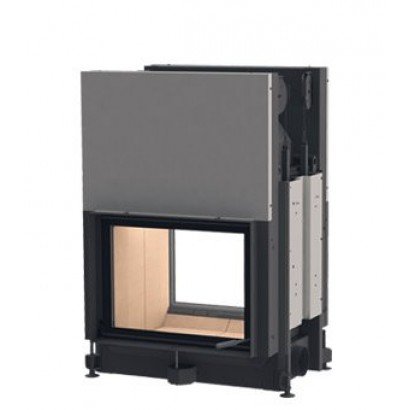 Двухсторонняя каминная топка с прямым стеклом. Топочная камера футерована шамотом. Подъёмный механизм двери (система Easy-Lift) с одной стороны. С другой стороны дверца откидывается для чистки. Возможно подключение воздуха извне.