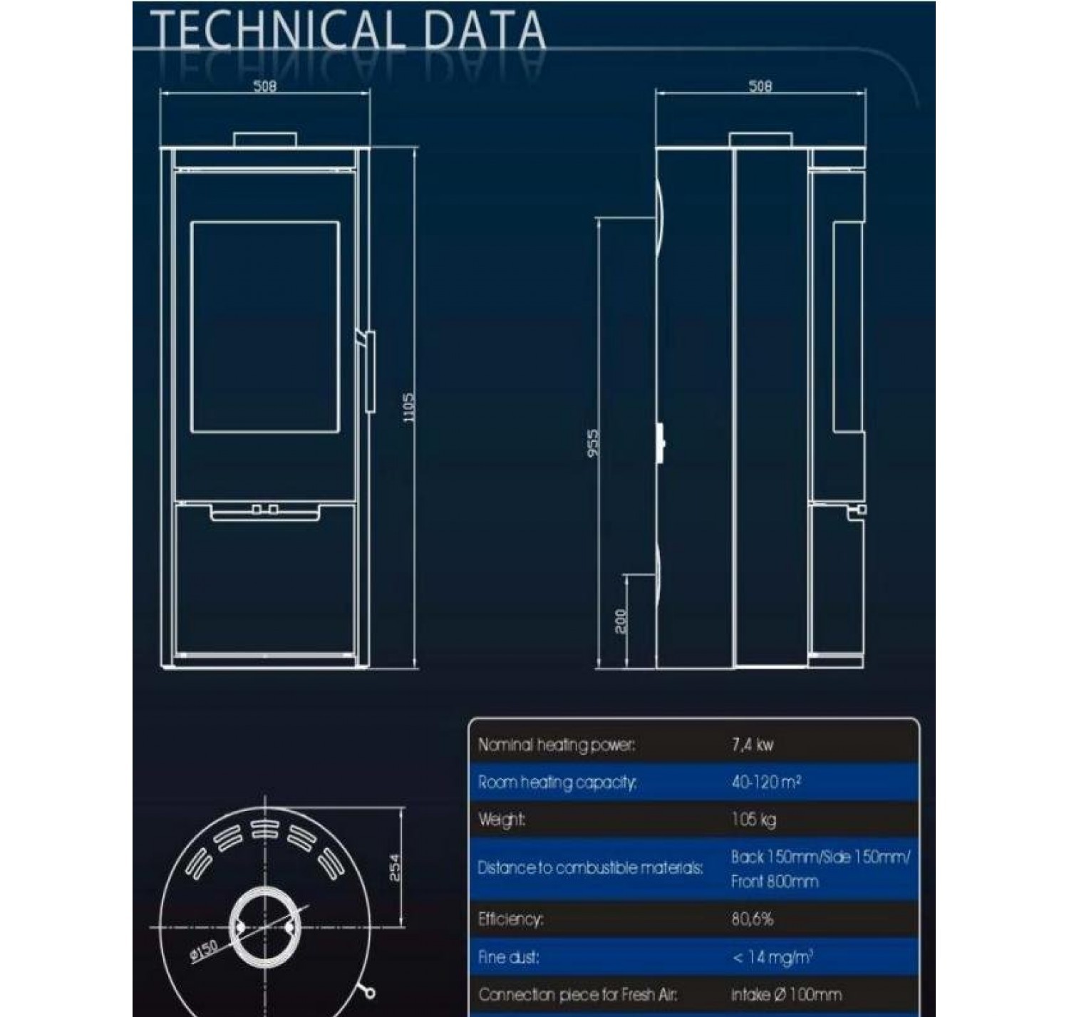 - Диаметр дымохода, (мм) 150 мм.