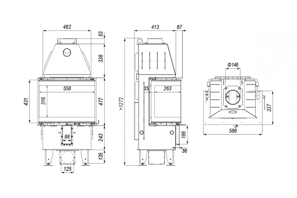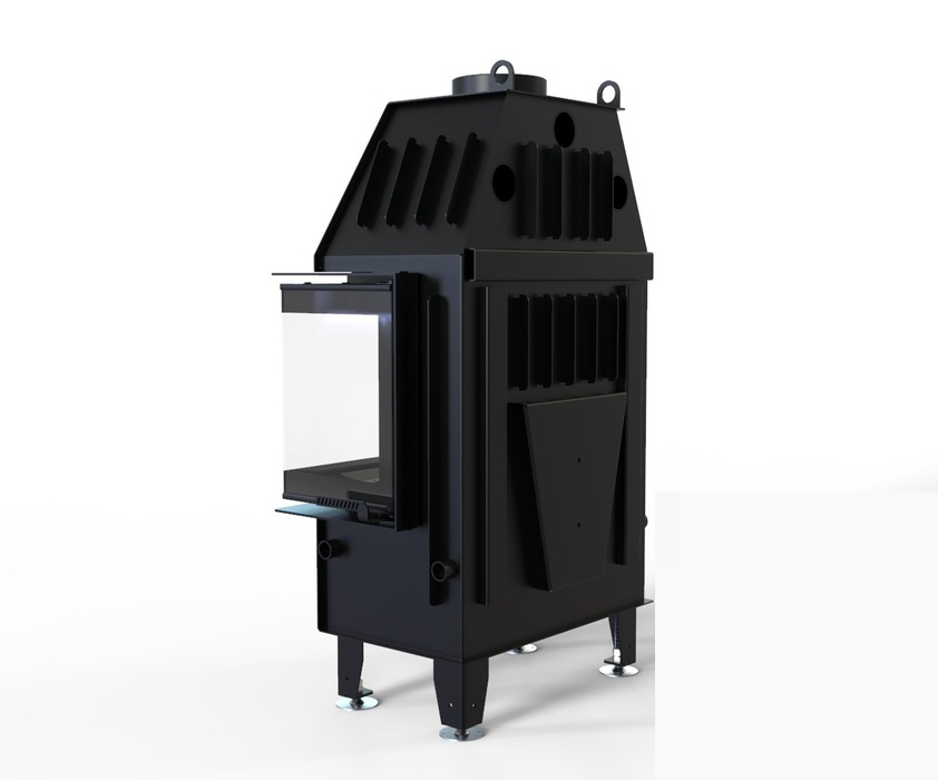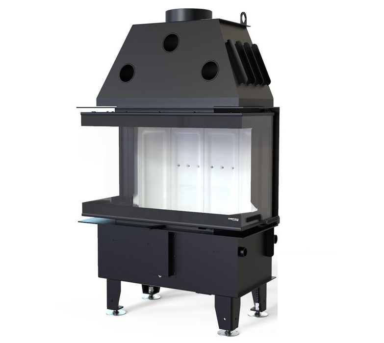 Трехсторонняя модель позволяет добиться максимального обзора огня в пристенном камине, создавая ультрасовременный интерьер. Камин оборудован закаленным стеклом, что способно выдержать температуру до 800 °С. Изделие изготовлено из высококачественной стали, имеет эффективность нагрева 80 % и отапливает помещения площадью 45-145 м². Экологически безопасная вставка обладает высокой энергоэффективностью ― класс A.