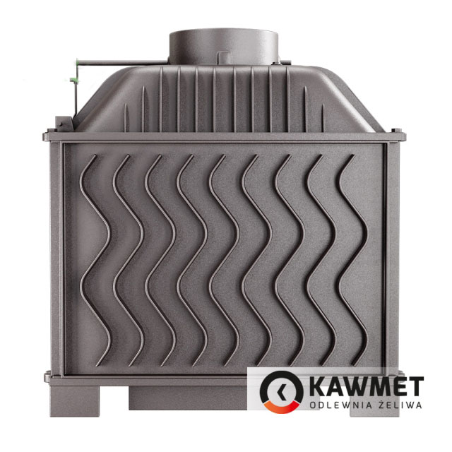 Для защиты корпуса каминной топки в конструкции топочной камеры также установлена двойная задняя стенка с красивым и объёмным рисунком, которая обеспечивает долговечность каминных топок KAWMET.