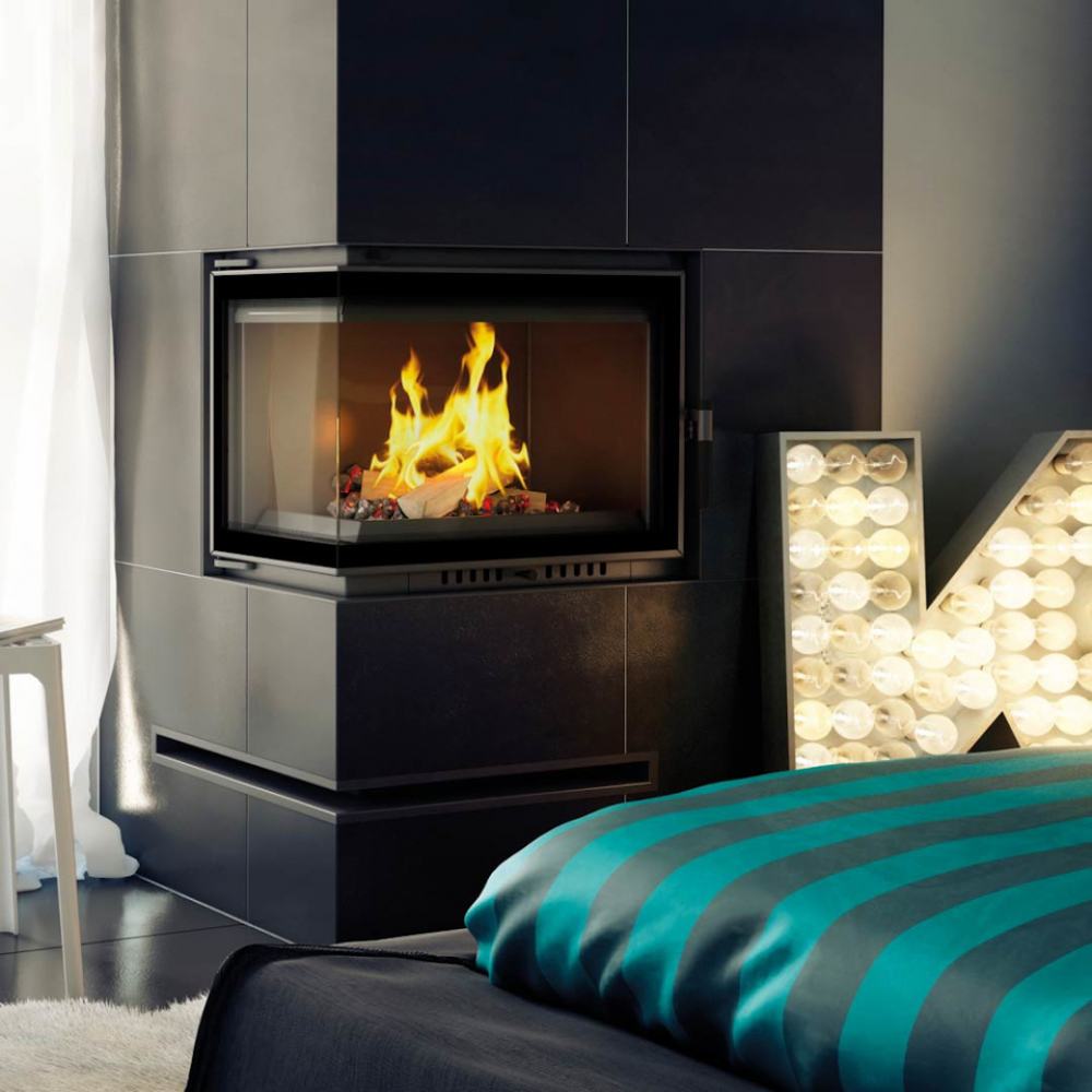 - Каминная топка с двумя стеклянными панелями, сопоставленными друг напротив друга под прямым углом (стеклянные панели соединены без рамы).