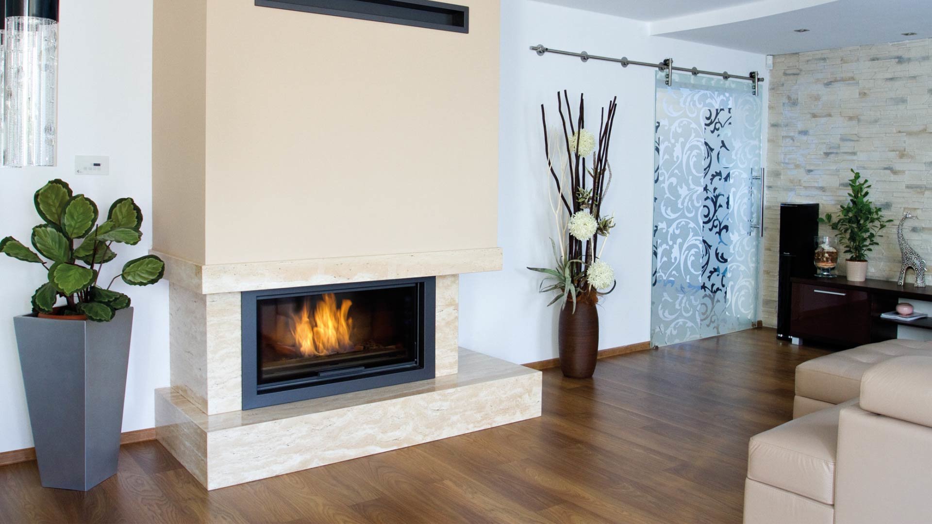 - Декоративная стеклянная панель типа glass, которая выдерживает температуру до 660 °C и предоставляет камину современный и элегантный вид, оптически увеличивает переднюю часть топки.