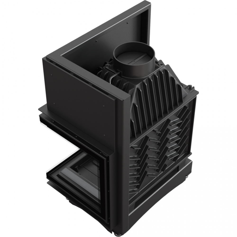 - Каминная топка с двумя стеклянными панелями, сопоставленными друг напротив друга под прямым углом (стеклянные панели соединены без рамы).