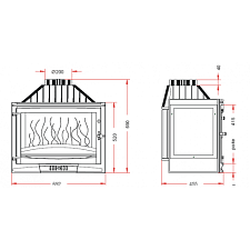 Благодаря П-образной тонкой рамки с черной тонировкой по краю стекла внешний облик топки носит современный характер. Модель удачно гармонировать с портальными облицовками из камня с добавлением элементов металла и стекла.